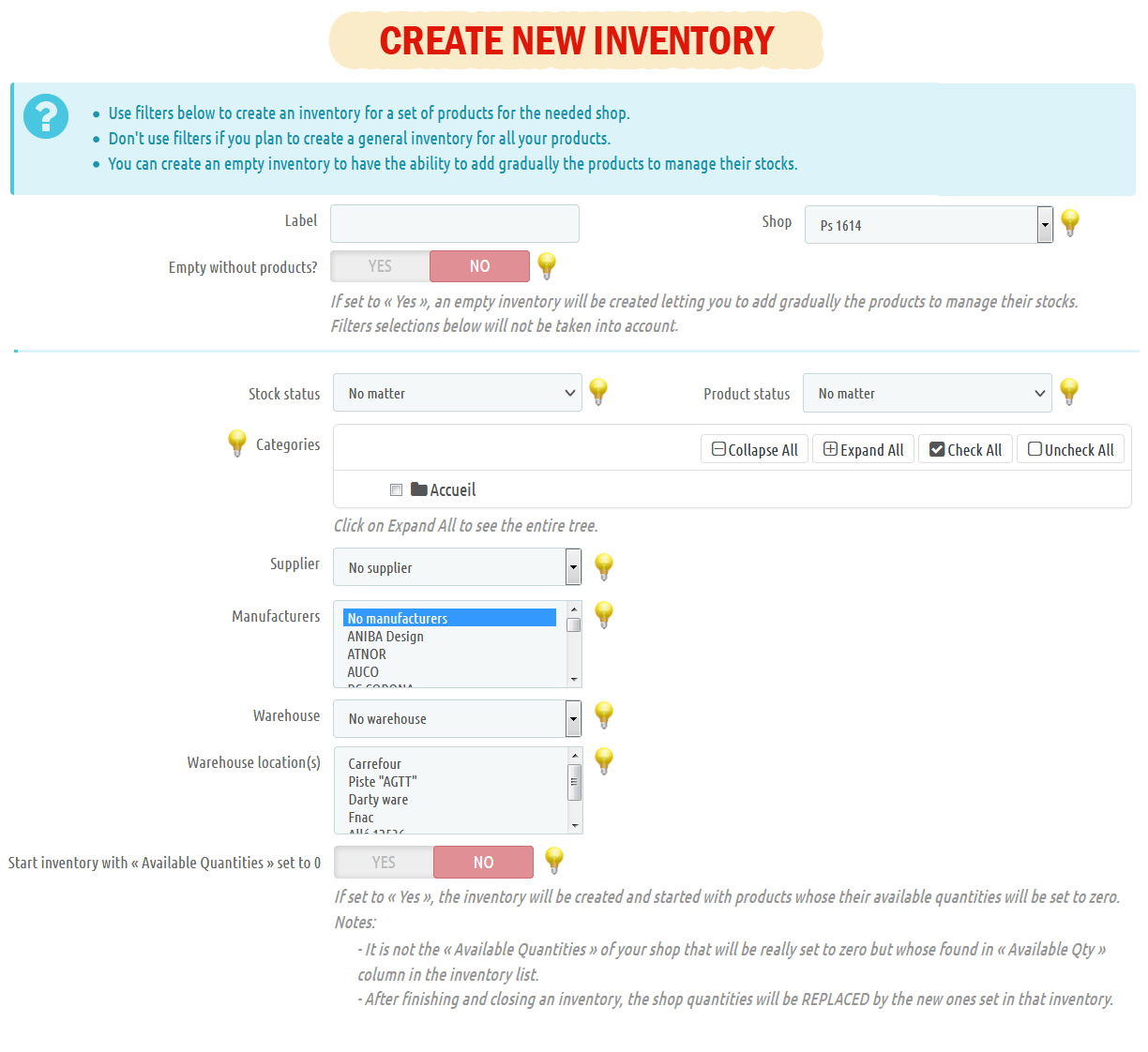 - There are different ways to create an inventory: Either for all products, or for a set of products or by creating at the beginning an empty inventory and then adding progressively products / combinations.Adjust / correct for each product / combination belonging to the inventory its final and real quantity in stock.
