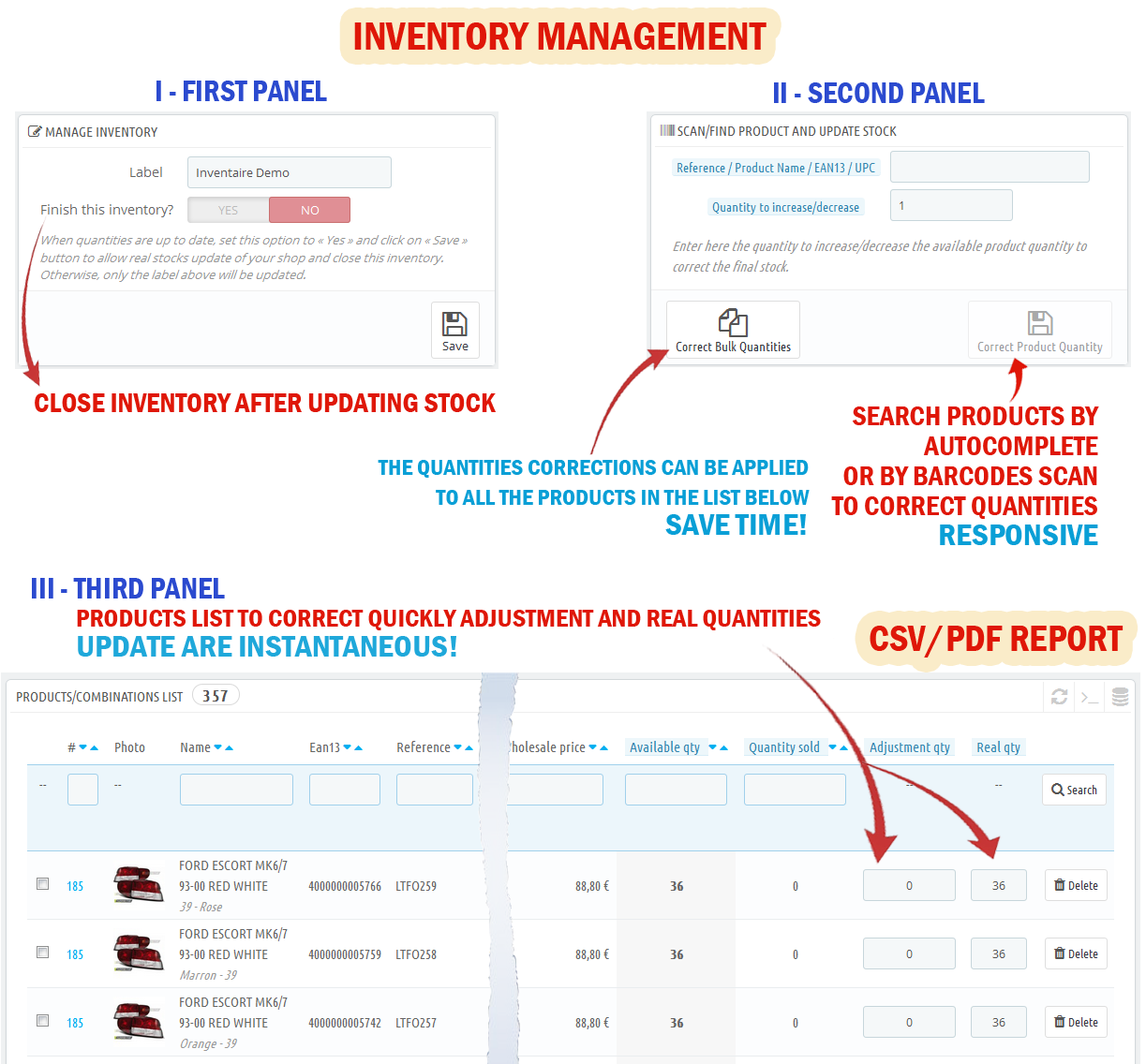- The quantities corrections can be applied in bulk to your products to facilitate the management.