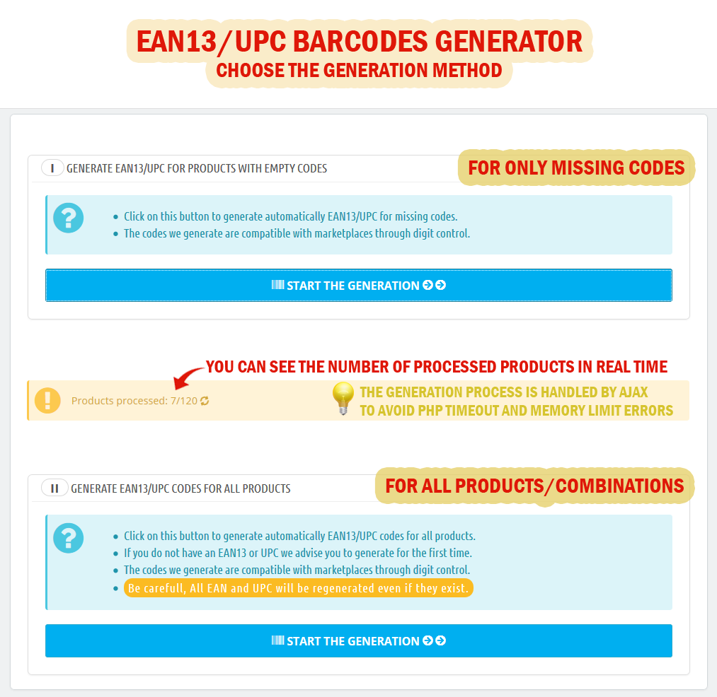 - Generate valid EAN13 and UPC codes for your products/combinations if you just need unique codes (for logistic reasons).