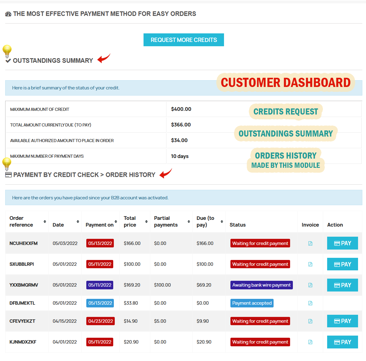 - Facilitate B2B commerce for customers; indeed, dealers don't have to pay you directly on your shop to purchase their products but just using their outstanding to do. Real payments can be done later (by check, bank wire, etc.).