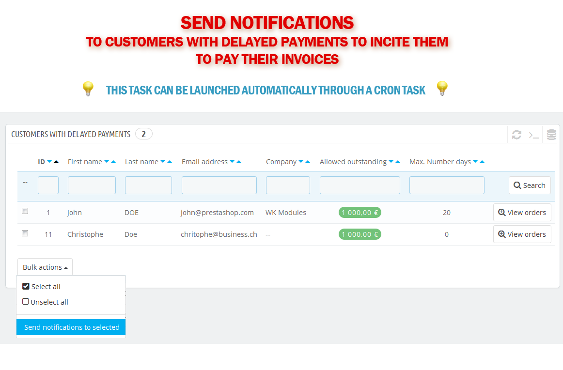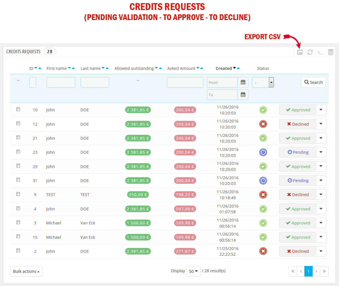 Once a customer with outstanding allowance buys from your shop, it appears on the module page. This enables you to get an overview of your current outstanding invoices. Meaning the amount of money you are allowing them to buy your products before they have to actually pay you.